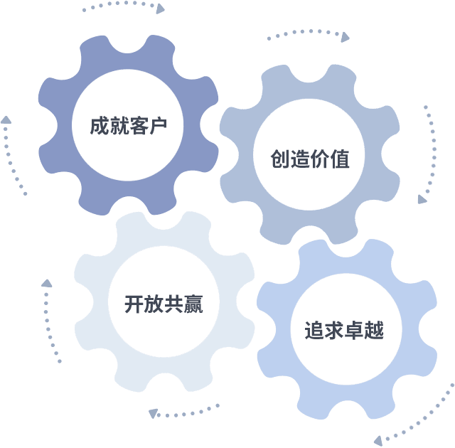 成就客户是一切决策的出发点,,,创造价值是衡量所有工作的标准,,追求卓越是我们做事做人的态度,,,,开放共赢是我们的格局也是最终的结果。。。价值观的齿轮环环相扣,,,推动着组织里的每个人不断向前。。。。