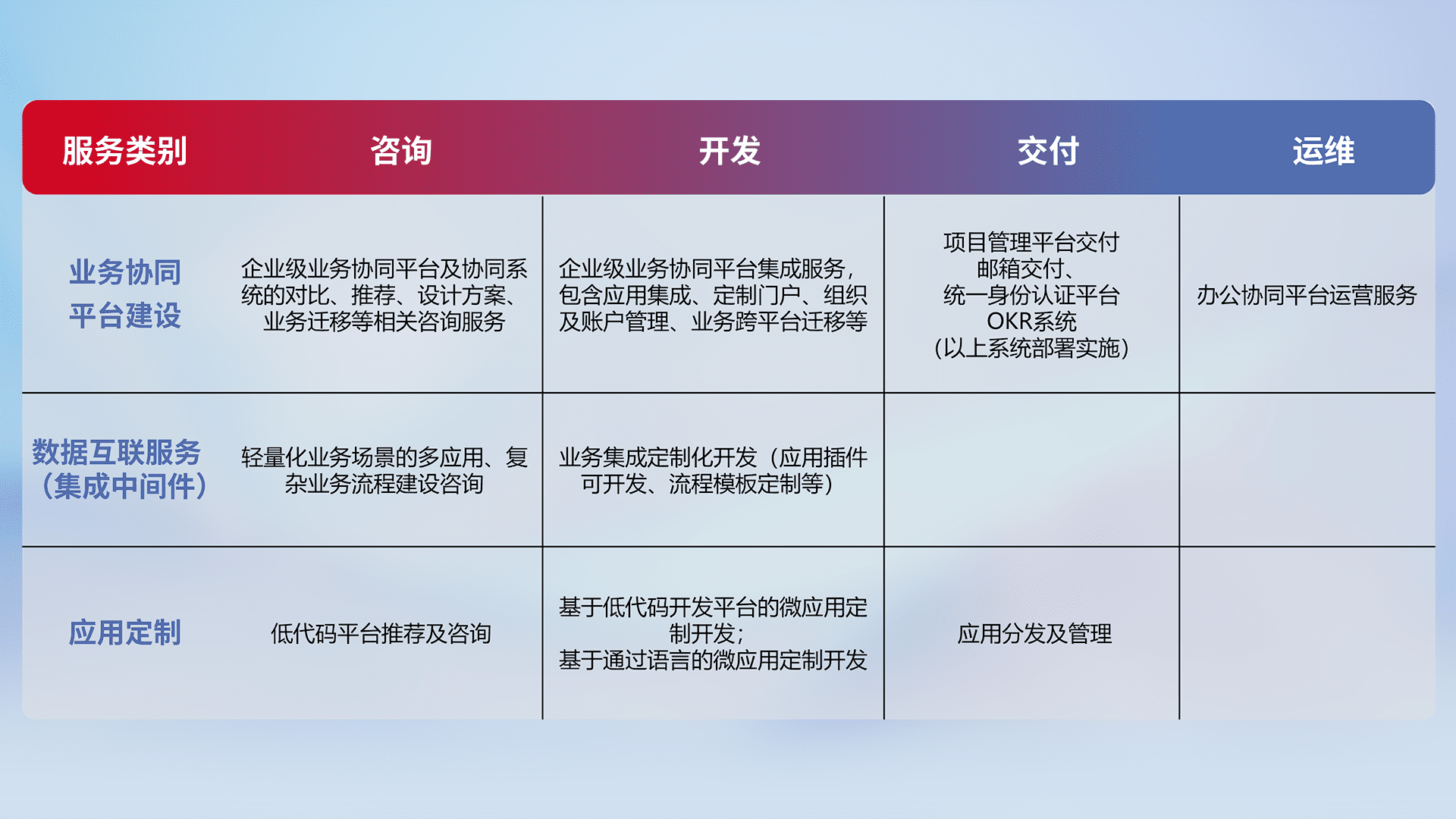 针对钉钉、、、企微、、、、IDaas等平台级产品提供产品的规划、、、方案、、、、交付、、、定制化开发等服务,,,,实现如统一协同办公、、智能客户服务、、、、混合会议管理、、、智能数据查询、、、等业务场景,,,,实现数字化转型。。