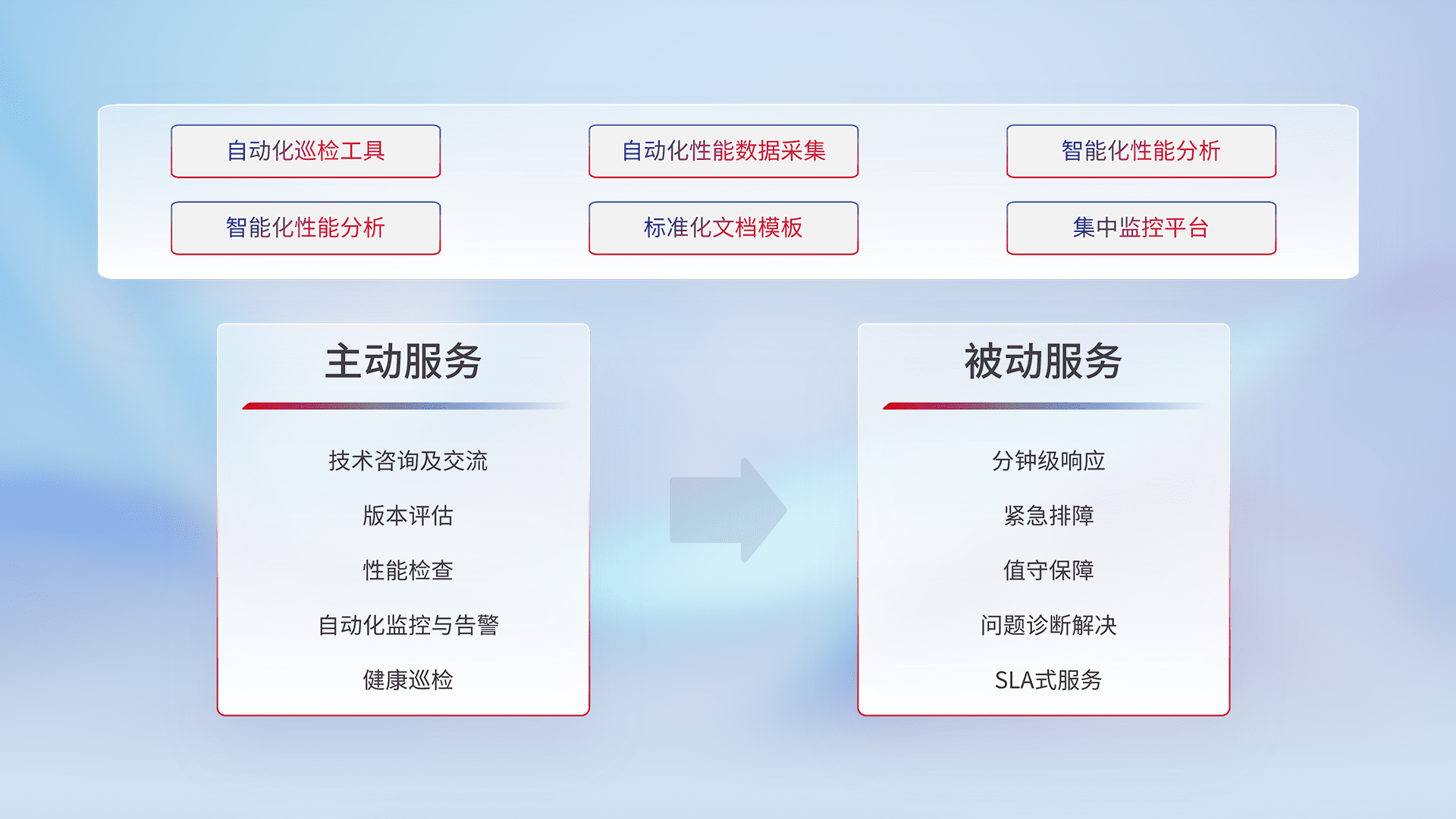 智能化工具和标准化文档,,保障服务质量,,,提供主动服务(包含技术咨询、、、、版本评估、、、、性能检查、、、、自动化监控与告警、、、健康巡检)和被动服务包含(分钟级响应、、紧急排障、、值守保障、、、、问题诊断解决、、SLA服务)。。
