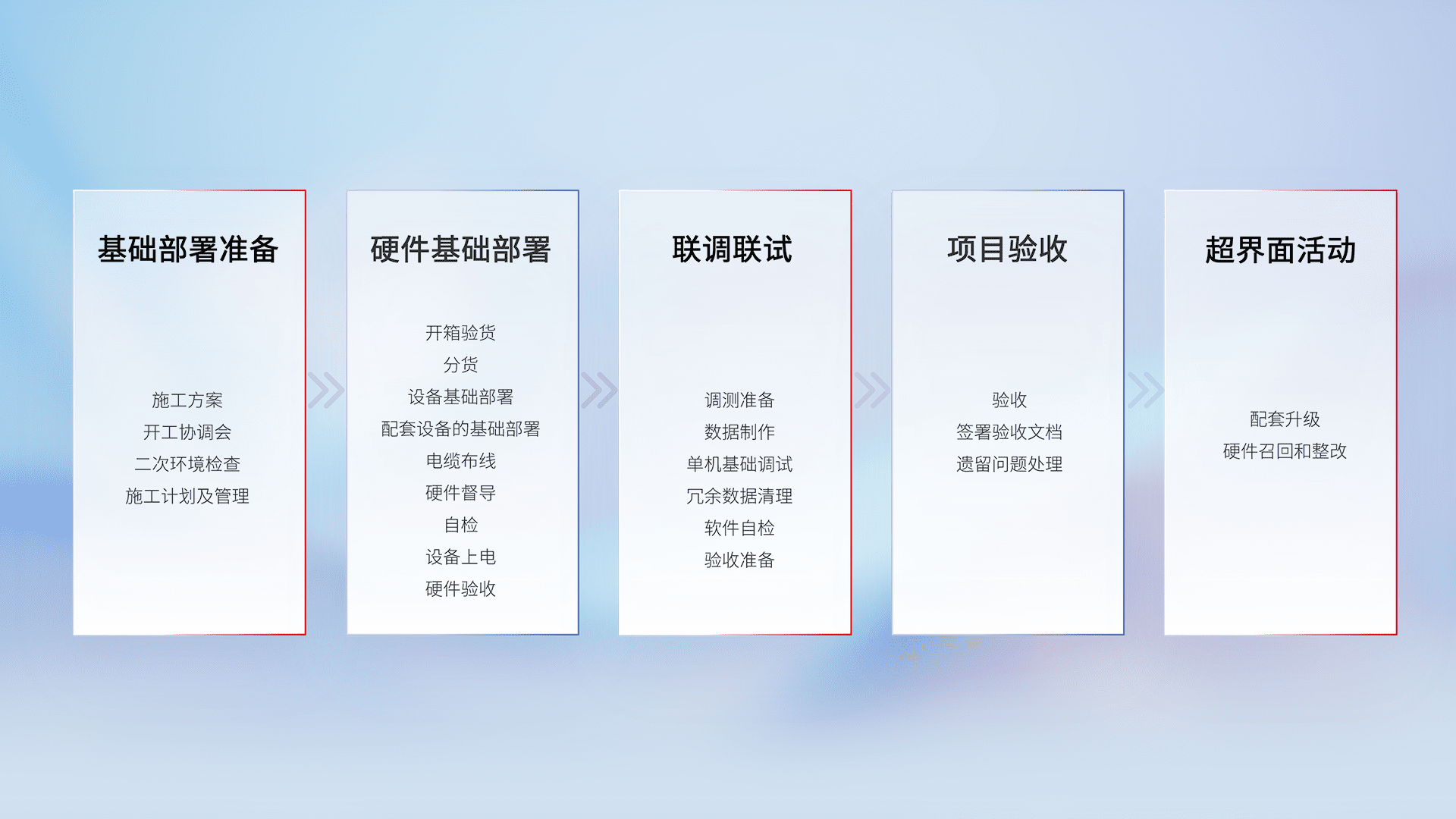 从基础部署准备、、、硬件基础部署、、、联调联试、、、项目验收、、、、越界面活动的全过程可追溯,,,,保证施工质量和进度。。。。